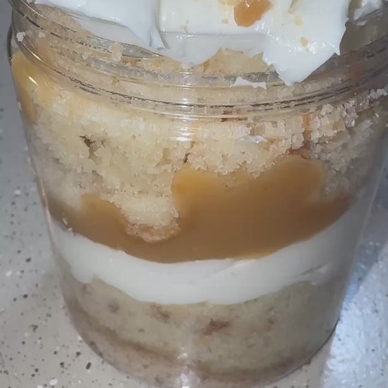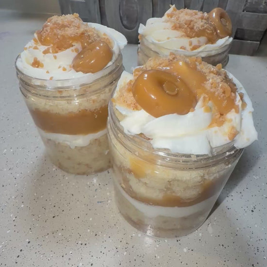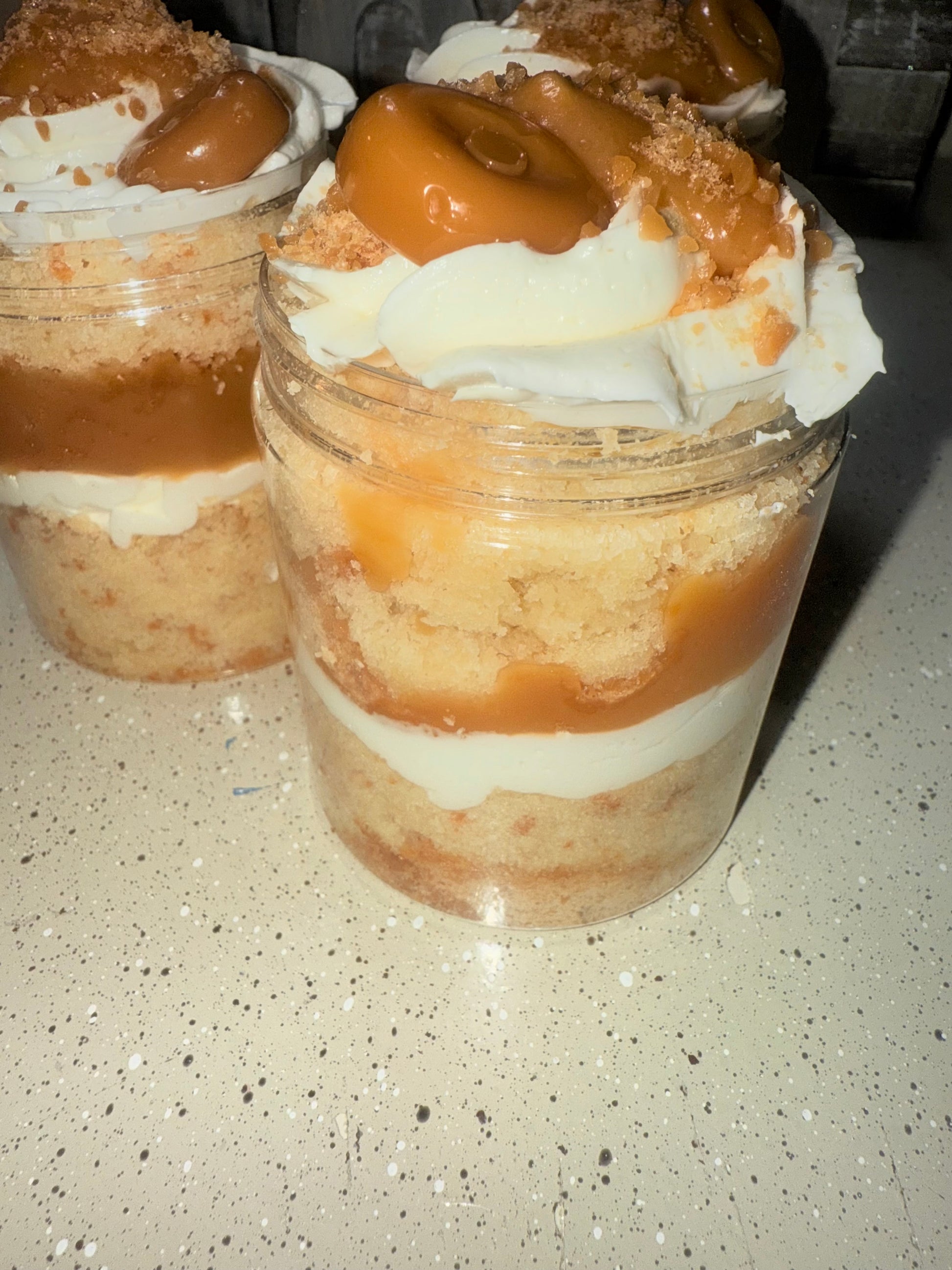 Indulge in the Caramel Crunch Cake Jar, where rich caramel-flavored cake is layered with silky buttercream and topped with homemade caramel. Enjoy the delightful crunch that adds texture and elevates every bite. This irresistible treat is perfect for satisfying your sweet cravings—don’t miss out!