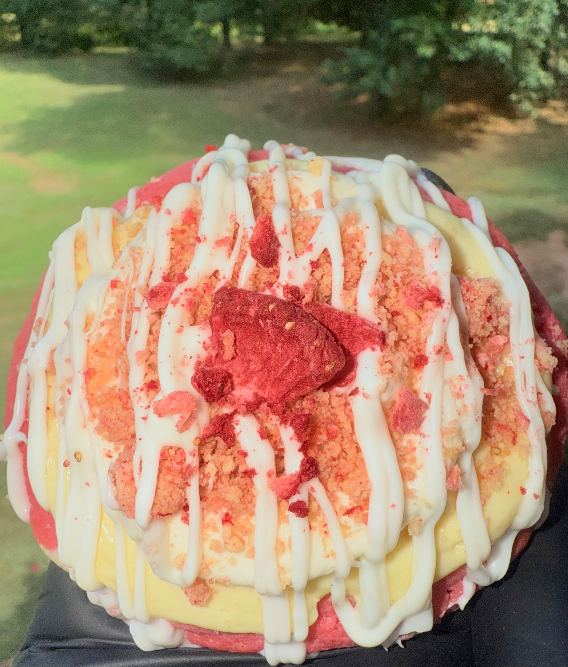 Experience the ultimate indulgence with Puddin' Pretty In Pink—a moist, soft strawberry cookie topped with creamy banana pudding, tangy cream cheese icing, and a crunchy strawberry crumble. Finished with a delicate drizzle of white chocolate, this treat offers a perfect blend of textures and flavors that will captivate your taste buds and leave you craving more.