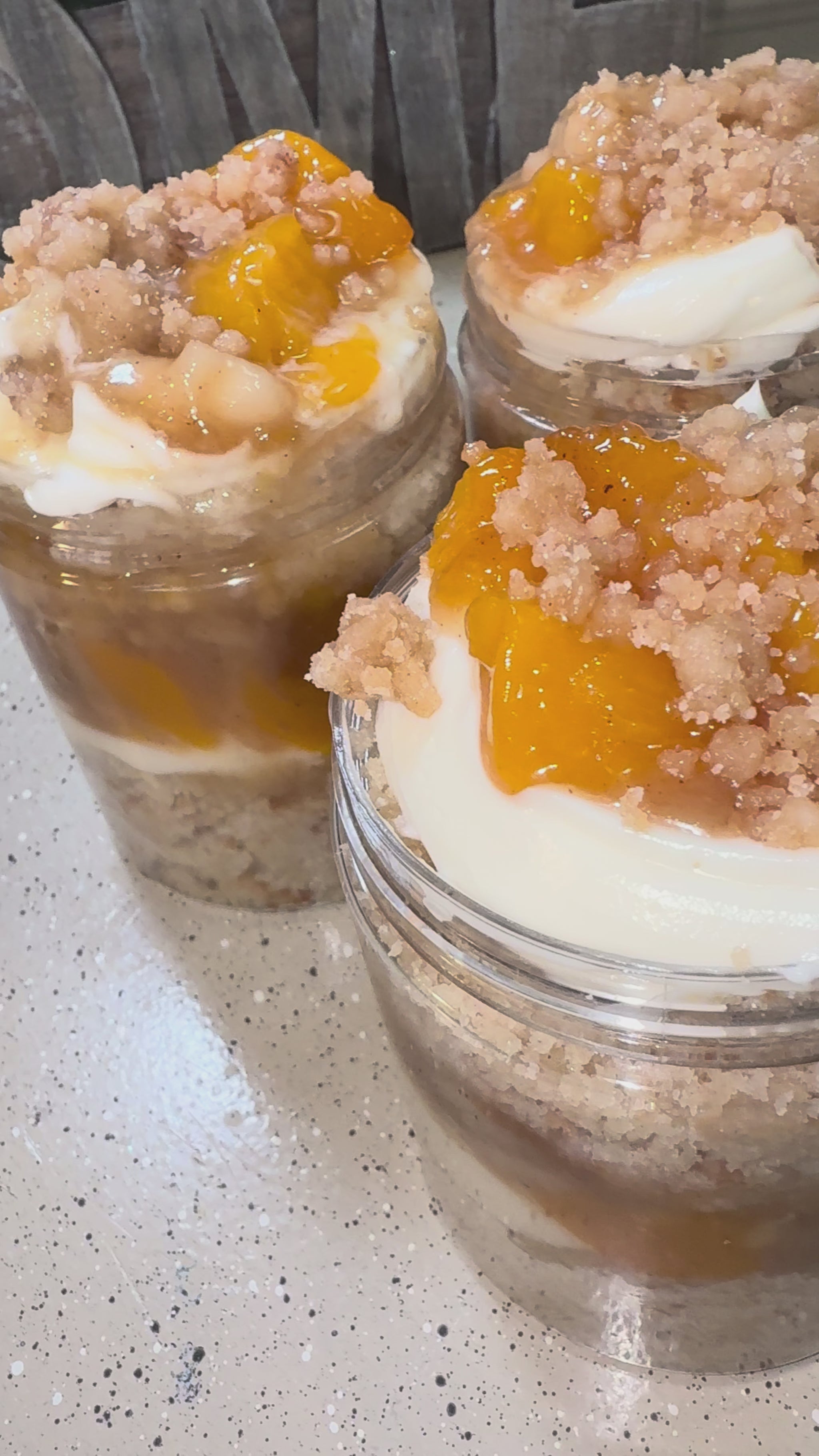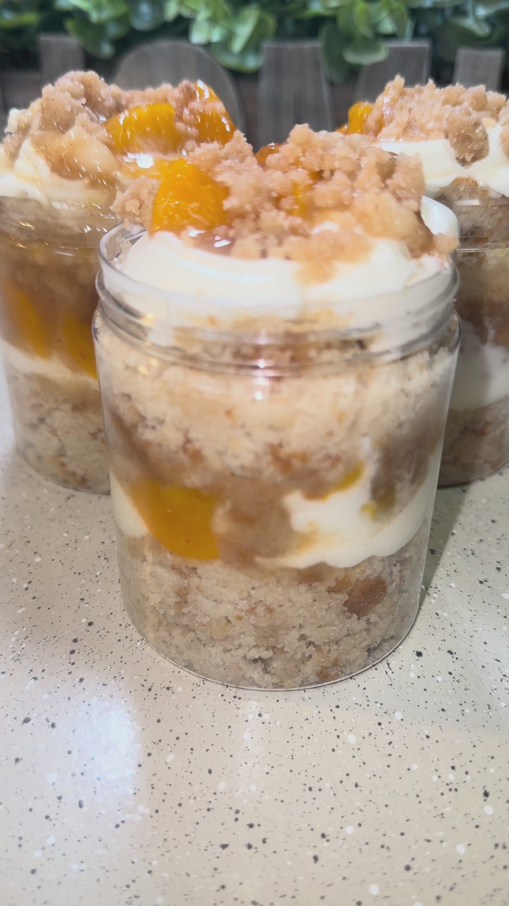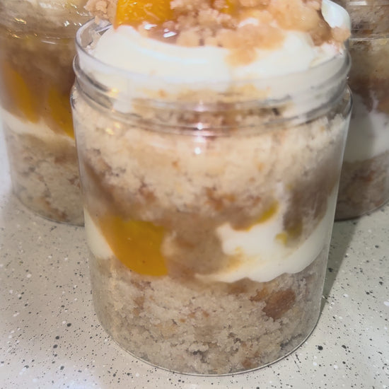 Indulge in luxury with our Cobbler Me Cute Cake Jar. Moist vanilla cake w/ a hint of cinnamon delicately layered with peach cobbler, creamy vanilla buttercream, and streusel. Satisfy your cravings for both cake and cobbler in one elegant and exclusive treat. Perfect for any sophisticated palate.