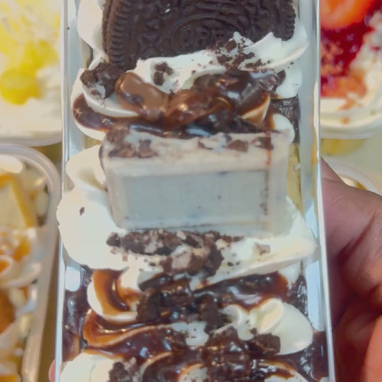 Indulge in the decadent Cookie-n-Dream Mini Cake. Rich chocolate sandwich cookies add a delightful crunch to the moist cookies n cream cake, while velvety buttercream elevates the experience. Crowned with a crumbled cookies, a piece of cookie n cream candy, and a drizzle of luscious chocolate ganache, this mini cake is a true dream for your taste buds.