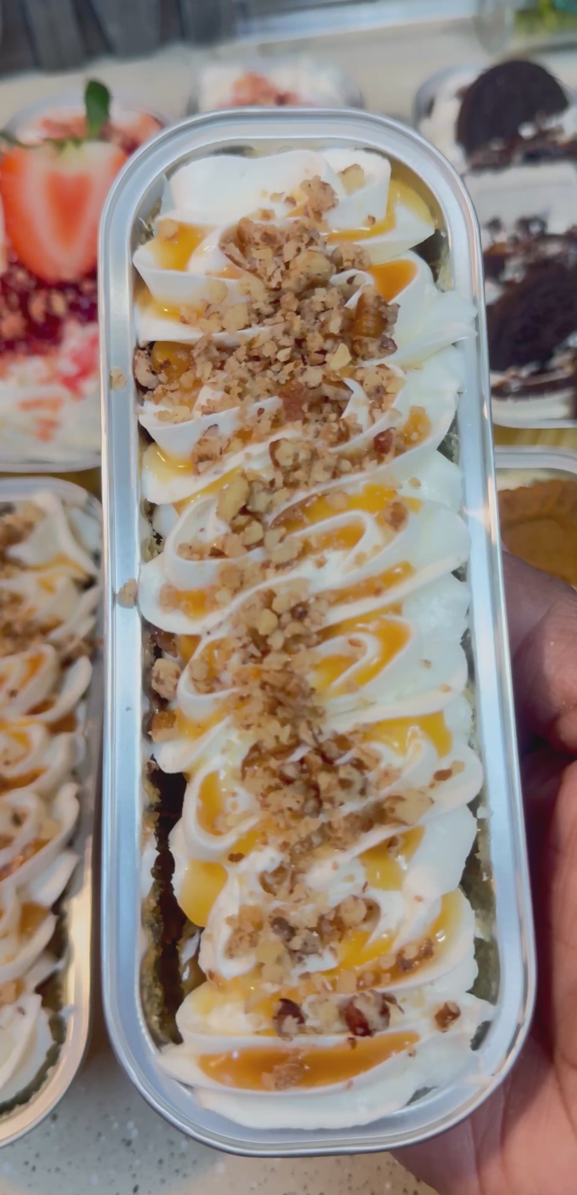 Indulge in the luxurious combination of moist caramel and pecan cake, crowned with toasted pecans and a tantalizing caramel drizzle. A decadent layer of buttercream adds the perfect touch of richness to this delectable treat. Satisfy your cravings for something sweet and sophisticated with What's Caramel w/o Pecans.
